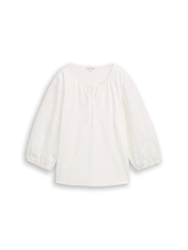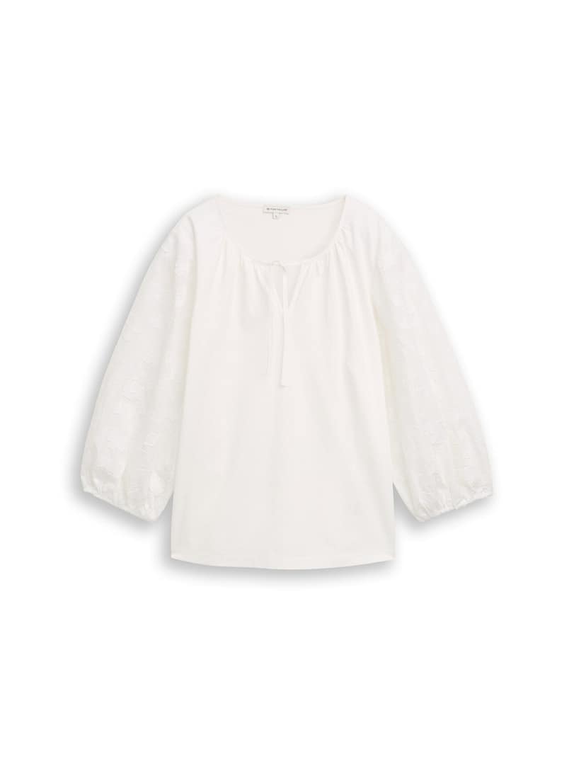 Longsleeve met 3/4-pofmouwen van geborduurd jacquardweefsel en elastische boord aan de mouwzoom. Met split in de zijnaad en strikdetail bij de halslijn. Van soepelvallend jerseyweefsel.