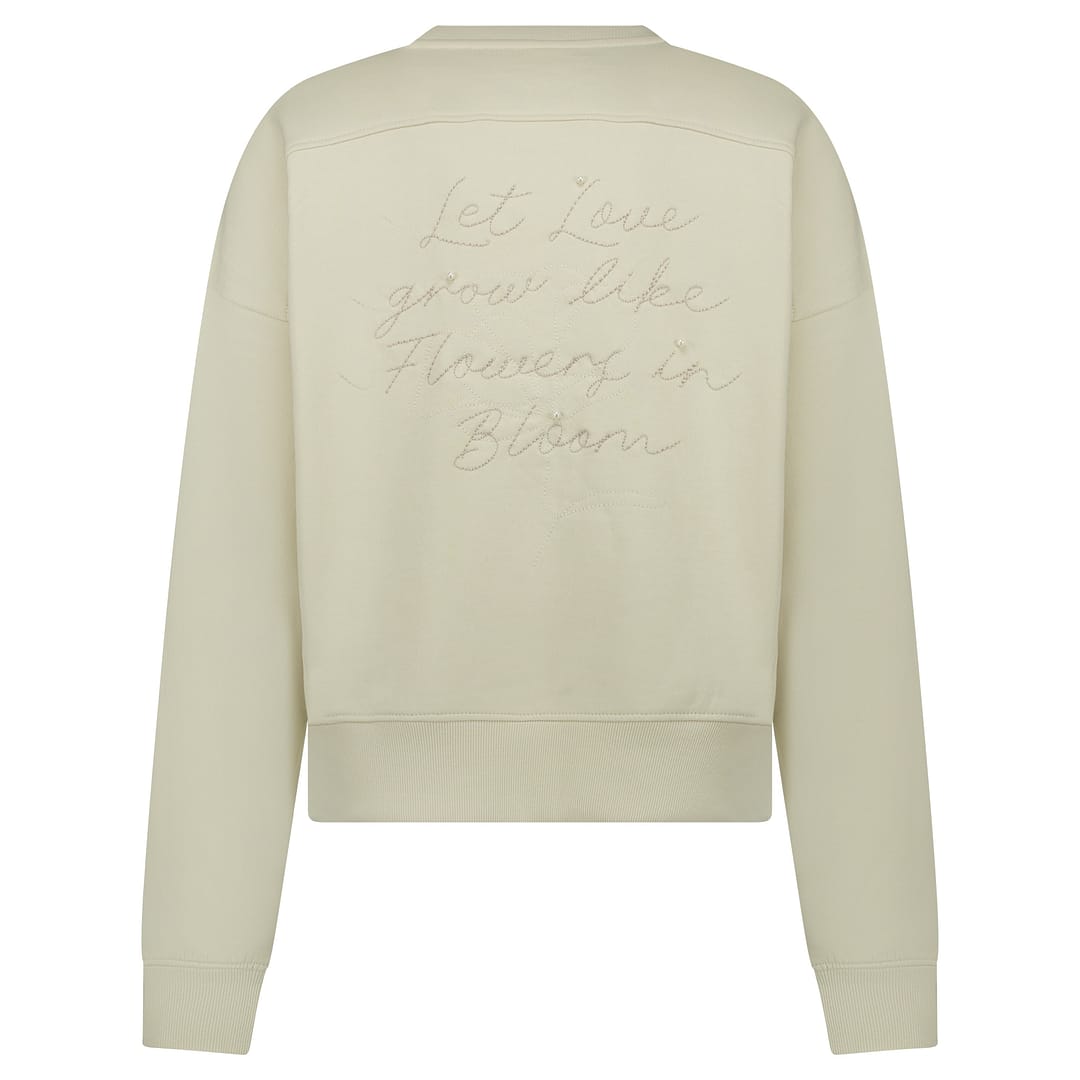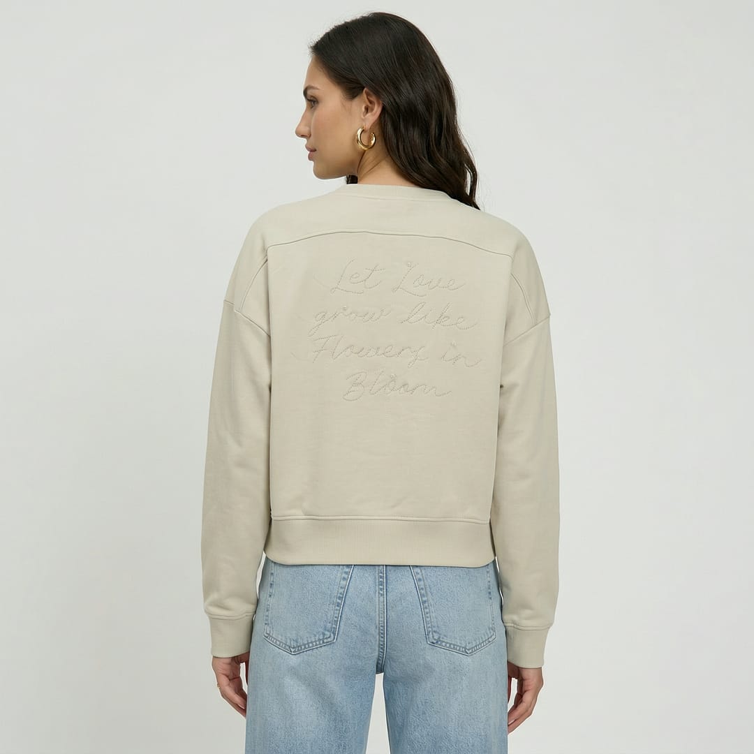 Sweater Boya is een zachte en stijlvolle trui voor dames met een subtiele boodschap. De voorkant is clean en minimalistisch met een fijne borduurtekst op de borst, terwijl de achterkant verrast met een elegante quote die is afgewerkt met glanzende details. De trui heeft een comfortabele pasvorm met verlaagde schoudernaden en een iets kortere lengte, ideaal om te dragen op een high waist jeans of rok. Perfect voor een casual en romantische look met een vleugje finesse.