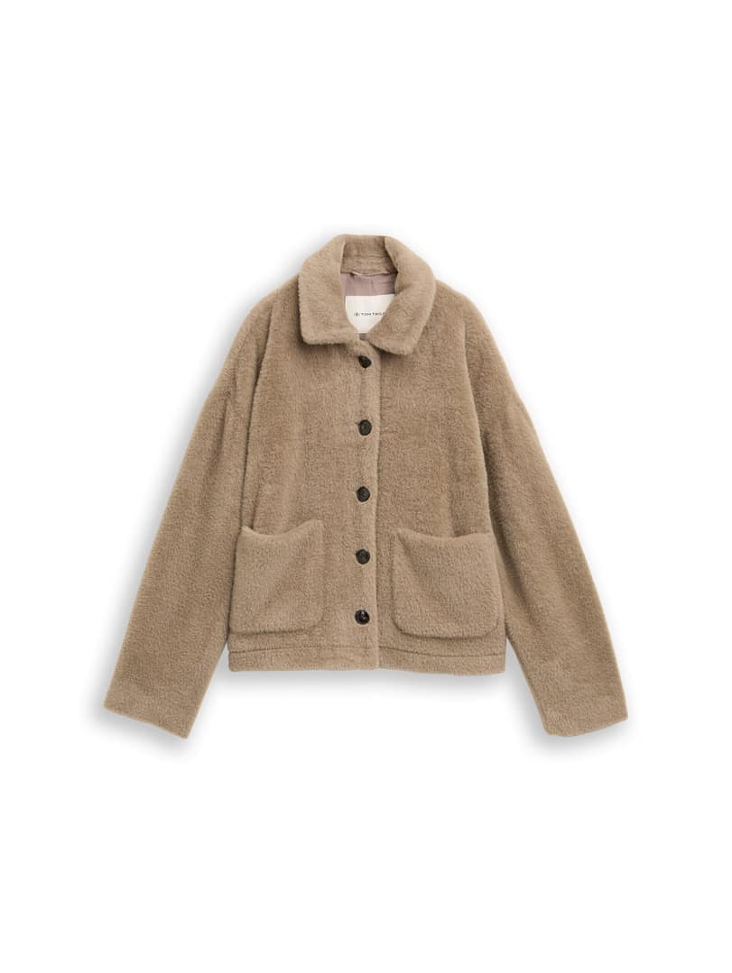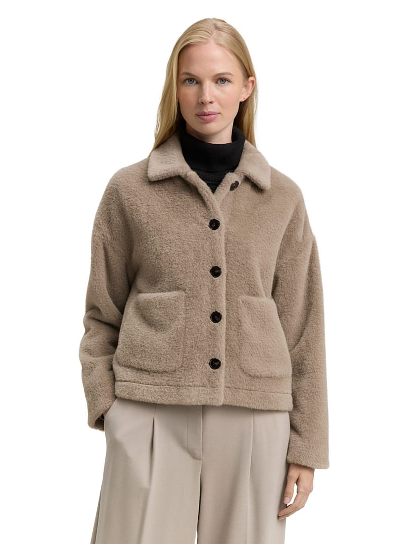 Zachte jas met kraag, knoopsluiting en opgestikte zakken aan de voorkant